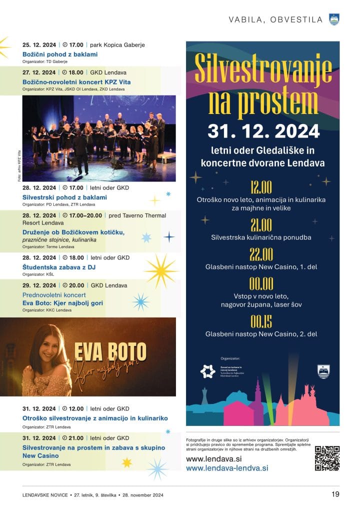 Praznični december, ki je od pričetka adventa ponudil številne vsebine in dogodke, se bo v Lendavi zaključil s koncerti v Gledališki in koncertni dvorani Lendava ter dogodki na prostem. 25. 12. v Gaberju pripravljajo Božični pohod z baklami, 27. 12. bo v dvorani potekal tradicionalen Božično-novoletni koncert KPZ Vita, nato še dva dni kasneje 29. 12. Prednovoletni koncert Eve Boto: Kjer najbolj gori, za katerega so vstopnice žal že pošle.